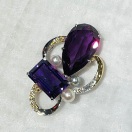 同じ宝石のペンダントトップとリングを思い切りよく合わせ、深いパープルが高貴な印象のブローチに。